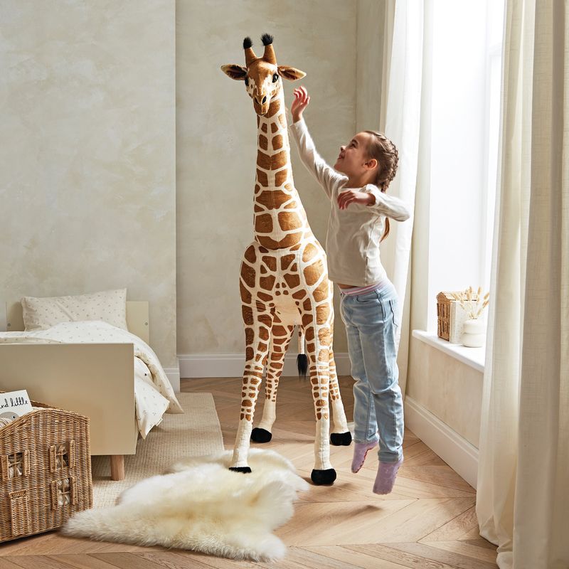 Watch your little one’s eyes widen in excitement when they see the large standing giraffe! Our standing giraffe plush toy is the cutest addition to any nursery or playroom that sparks creative play for your little one and looks adorable in the room.
