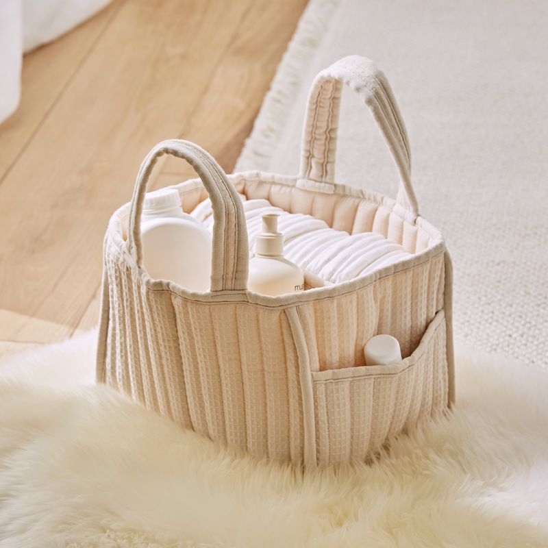 The CuddleCo Nappy Caddy is the perfect companion for nappy changes. Our quilted waffle nappy caddy is both stylish and practical, designed to hold everything you need for a smooth nappy change. With three internal compartments and a handy outer pocket, there’s space for nappies, wipes, creams and more. The structured design and sturdy handles make it easy to carry from room to room – or take with you on day trips.