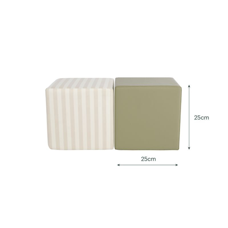 Bring movement, confidence and creativity to your child’s play space with the 2 Piece Play Cubes in neutral Cookie shade Stripe & Olive Green, suitable from 12 months. Designed to support early development, these soft foam cubes encourage stacking, crawling and low-level exploration — helping build strength, balance and coordination through play.