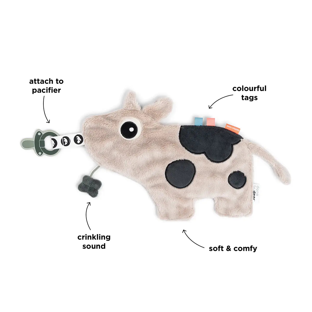 The practical Velcro clip keeps pacifiers close, perfect for on-the-go moments. Featuring the charming Dotti design in sand and black, along with colourful tags for visual stimulation, this cozy friend brings both comfort and play to your baby’s day. Let a Deer friend keep your little one cosy and calm.