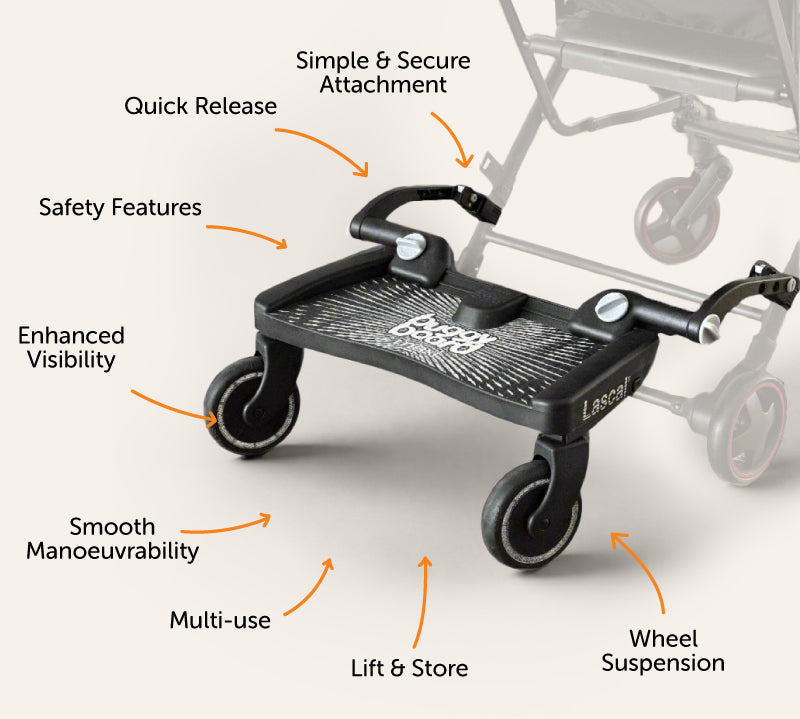 The original ride-on platform! The Lascal Maxi BuggyBoard® provides a safe and practical solution for tired toddlers aged 2 – 5, offering secure attachment to most pushchairs and ensuring a comfortable ride on any terrain – no need for a double buggy!