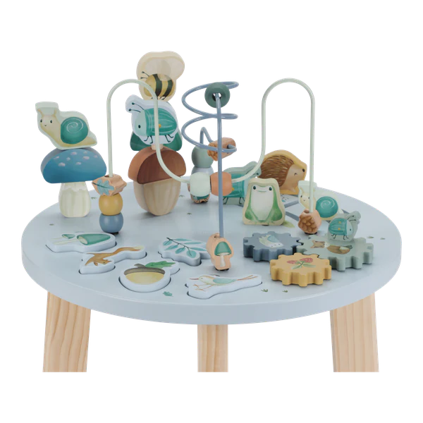 Stand up to play! Discover the many activities this table has to offer. Bring the beads along the spiral from one side of the enchanted forest to the other side. Or build a tower and fill the forest with trees of joy. Complete the puzzle, turn the wheels and help the lovely animals cross the Forest Friends woodlands. This wooden multi-activity table challenges your little one in many ways. There are 5 activities to explore that each support the development of fine motor skills. Thanks to the safe and balanced design, the activity table also encourages standing up. And staying up! Because the many features will keep your toddler engaged for a while. Assembly by an adult required.