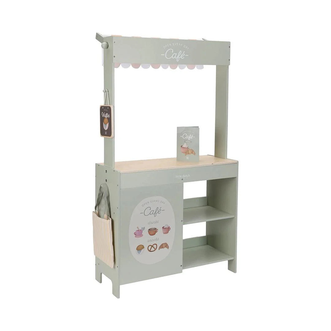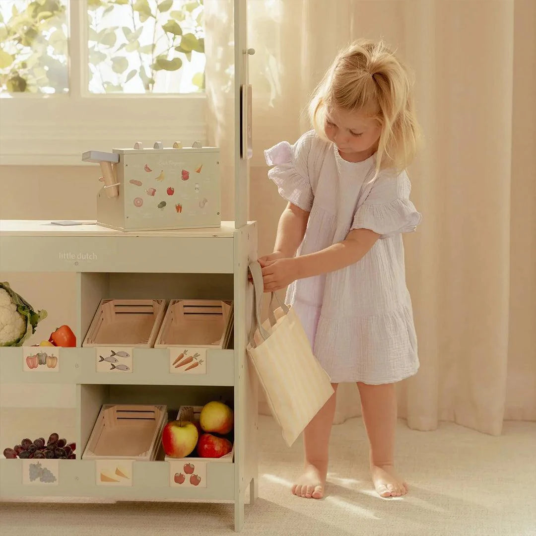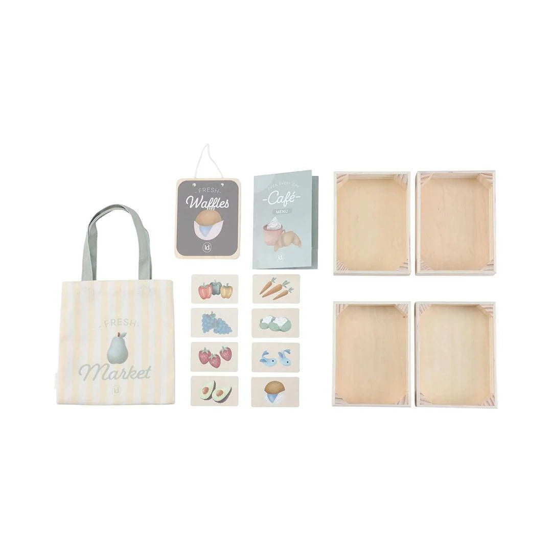 The set also includes a shopping bag and crates for a real shopping experience. Turn the market stall around and it becomes a café, complete with a menu and cheerful illustrations.