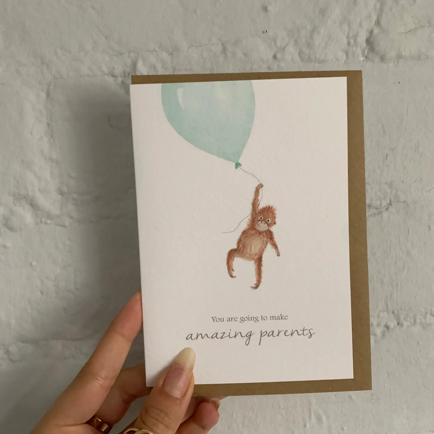 Floating into the sky grasping a large green balloon, a baby orangutan shares an encouraging smile over the baby card’s caption, reading “You are going to make amazing parents”. The lovely gender-neutral design is perfect for all types of couples and all new babies, with space on the blank inside of the new parent card for a personal message. A lovely baby shower gift, the high quality greeting card is designed to be long lasting, using thick, sturdy papers that are sourced sustainably from FSC-certified forests.