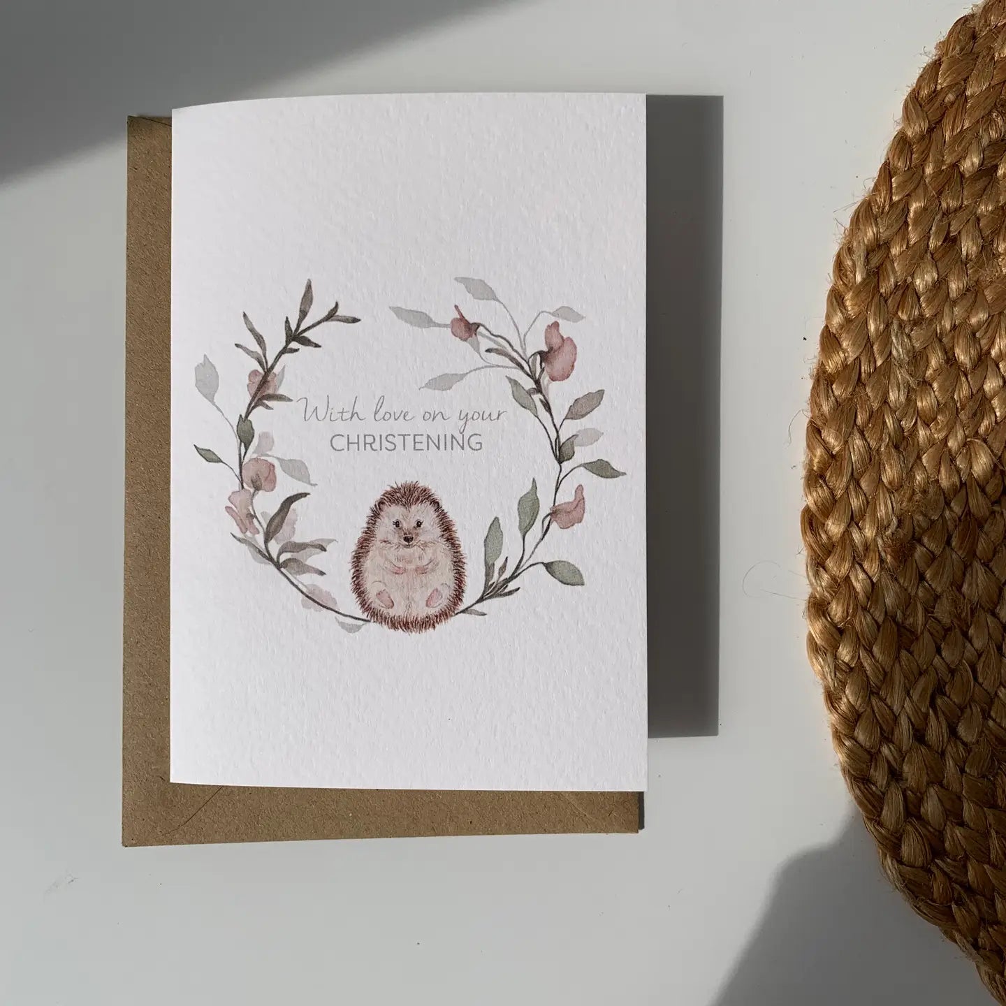 A lovely little hedgehog is here in beautiful watercolour artwork on this christening card to celebrate a monumental occasion. The sweet little animal sits in a floral wreath that wraps around the greeting card’s caption, which reads “With love on your Christening”, while the inside of the card is blank and ready for a personal message of celebration. T