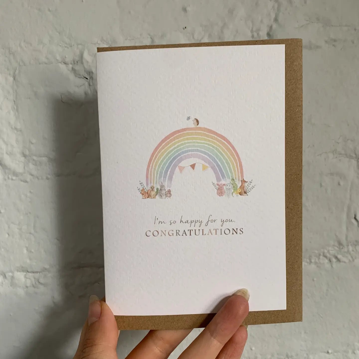 With a family of watercolour animals, the rainbow on this new baby card has been designed for miracle babies, drifting above the ‘I'm so happy for you. Congratulations’ caption. With space on the blank inside for a handwritten message to make it personal. This new parent card is part of a growing collection of greeting cards featuring the distinctive watercolour art style from UK based brand Little Roglets.