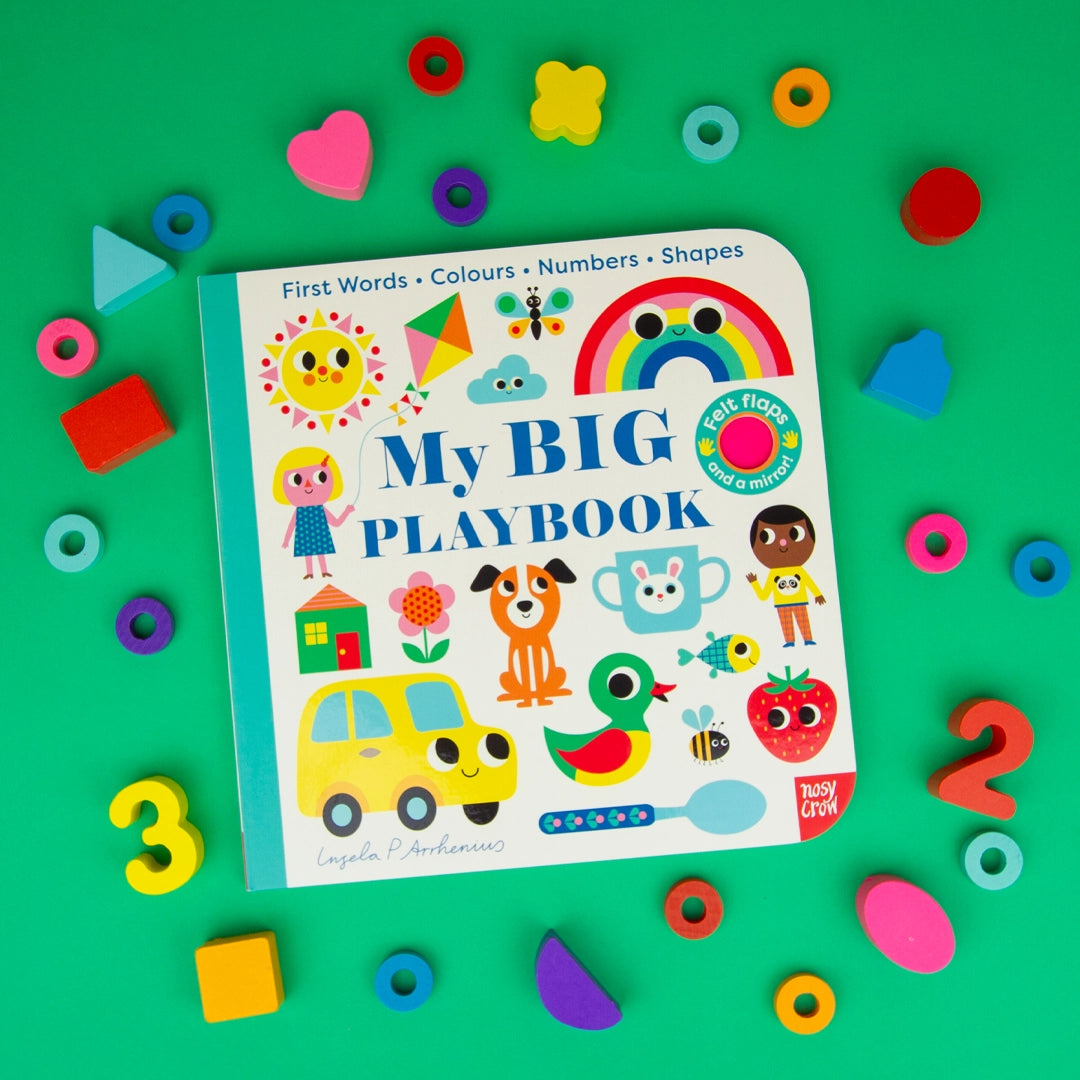 A big book for sharing with a little person, introducing first words, colors, numbers, shapes, and more - with felt flaps and a mirror!