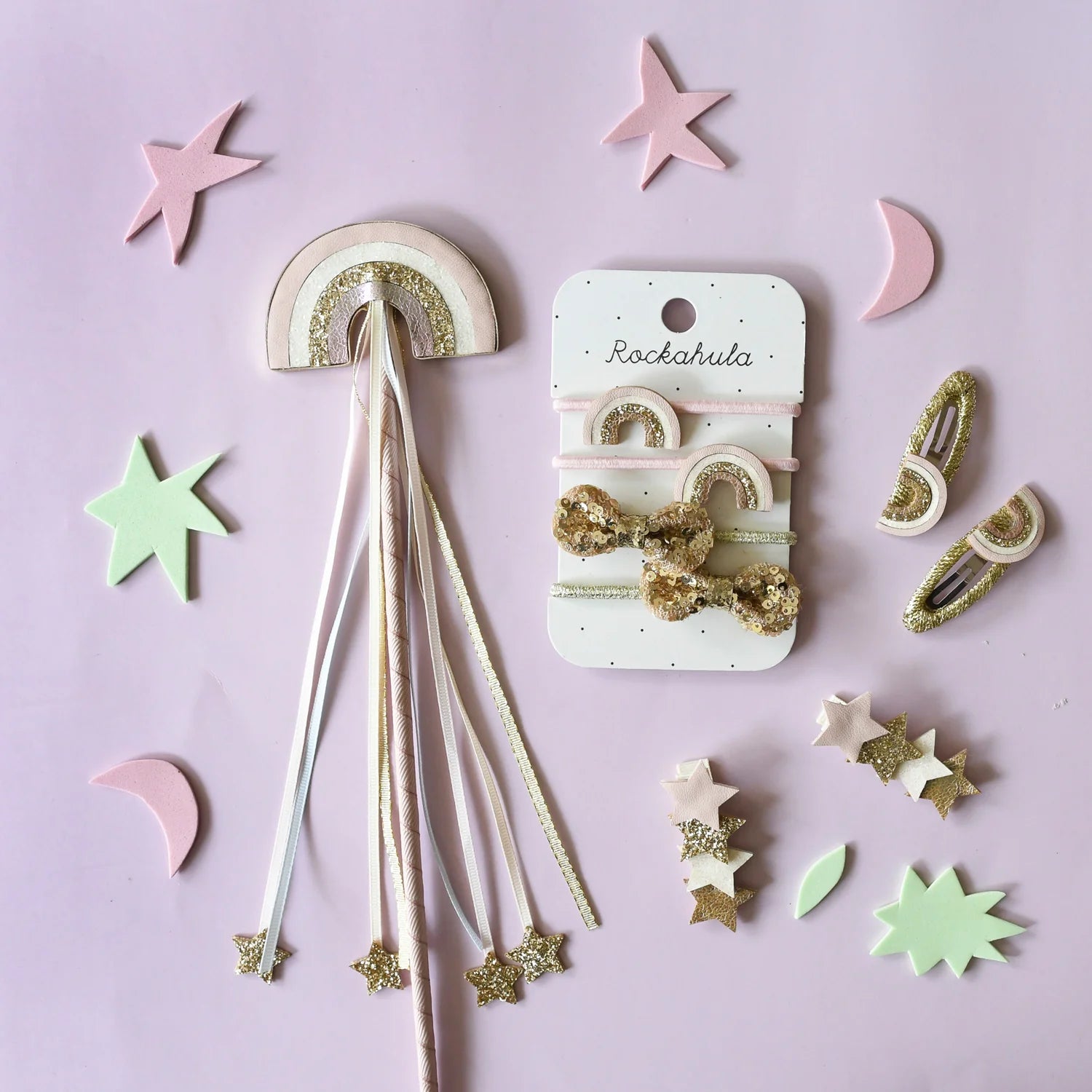 Fall under our magical spell and discover a world of enchantment with our shimmering rainbow clip set. Made from the softest colour palette with a hint of sparkling gold and set onto gold wrapped snap clips.