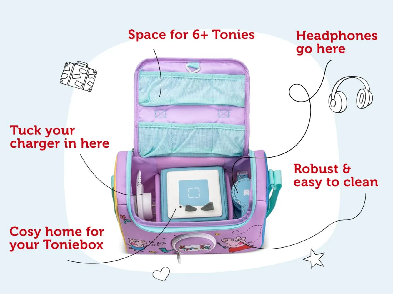 Keep their Tonies and Toniebox safe from muddy puddles with this Peppa Pig Listen & Play Bag. With space for a Toniebox, headphones, charging station and loads of Tonies, this bag is perfect for keeping all the essentials safe and sound and in one place. There’s even a flap so they can open up the speaker for songs and stories on-the-go. The bags are robust and easy to clean, with padded dividers and mesh pockets to keep everything snug as a tonies® bug.